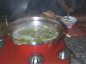 鍋を半分に仕切って2つのスープを味わうことが可能(左がオーソドックスな鶏ガラ、右がトムヤムスープ)。その中に好きな具材を放り込んでパクチー入りの辛いつけだれにつけて食べる。なおつけだれは好みのスープで少し割った方が単調な味付けにならない。どの具材も単品でオーダーできるが、