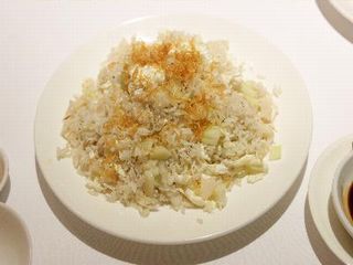 「ホタテと卵白のチャーハン(THB380)」は卵白のフワフワ感にお米と刻んだホタテとキュウリが絡まっており淡泊な優しい味。上にかかっている金糸状のふりかけっぽいのもホタテを揚げたものでアクセントになっている。