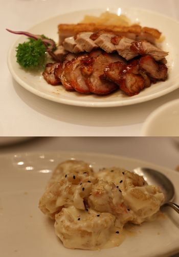 「バーベキュー三種盛り(写真上:S$20)」は皮付き豚肉(Suckling Pig)・豚肉肩ロース・鶏肉のロースト。皮付き豚肉はカリカリの皮と脂身のアンバランスが面白く香ばしさが美味。豚肉肩ロースと鶏肉はジューシーで味付けもしっかりしており酒の肴にもおかずにも最適。「海老のマヨネーズ炒め(写真下:S$28)」はいわゆるエビマヨですが、大振りの海老でプリプリ感が見事。万国共通で愛される味ですね。