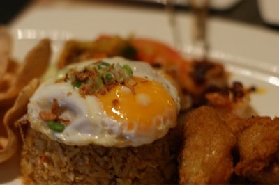 焼き飯自体の味はさほど特筆すべきレベルではないが、サテー、鳥の唐揚げ、ソフトシェルクラブの唐揚げといったサイドディッシュが美味。特にサテーは肉質が柔らかく深く味付けされており超美味!鳥の唐揚げも衣の下味が鶏肉にあっており十分単品で勝負できる味。ソフトシェルクラブ(半身)は新鮮なのか甲羅が柔らかく甲殻類独特の風味が丸ごと味わえる。焼き飯に乗った目玉焼きと揚げ玉ねぎの付け合わせも名脇役といった感じ。こんな料理が24時間食べられるとは素晴らしいホテル。宿泊しない場合は「melt」で食べられるのでしょうか?ちなみにここの朝食は極めて種類が豊富でどれも上等な味です。