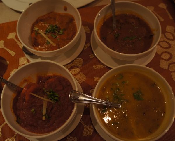 4種類の本格的カレー。「バターチキン(写真左上)」はバター(山羊の乳から作ったギー?)の濃厚かつまろやかな風味と鶏肉の旨味がマッチしている。「マトン・カレー(写真右上)」は羊肉独特の臭みがスパイスで抑えられており、苦手な人でもかろうじて食べられるかも。「エビ・カレー(写真左下)」はエビ味噌や甲殻部もエキスとして入っているようでエビの濃厚な風味が味わえる。見た目より深い味わいですね。「ダール(豆)・カレー(写真右下)」はレンズ豆?ひよこ豆?がベースのとろとろした食感で色も薄く辛くなさそうだが味はしっかりしておりスパイスと豆の甘さが絶妙。